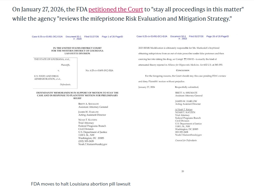 On January 27, 2026, the FDA petitioned the Court to “stay all proceedings in this matter” while the agency “reviews the mifepristone Risk Evaluation and Mitigation Strategy.”